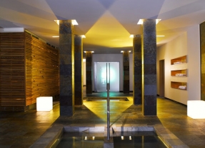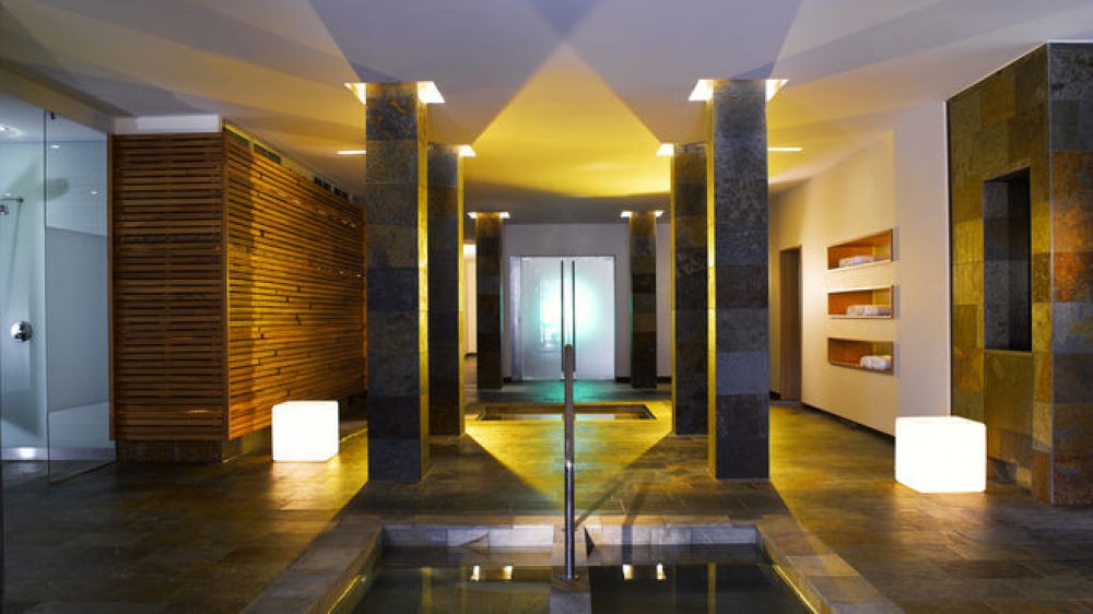 Sauna area with a Carinthian log cabin sauna, Gailtal valley sanarium, brine steam bath, whirlpool, senses pool, crushed ice fountain, cold-water canal, Kneipp treading pool, panoramic relaxation room, solariums, infrared room, relaxation room with water beds